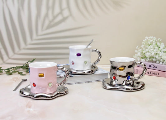 'Crystal' Ceramic Bejewelled Cup n saucer Set - Pink