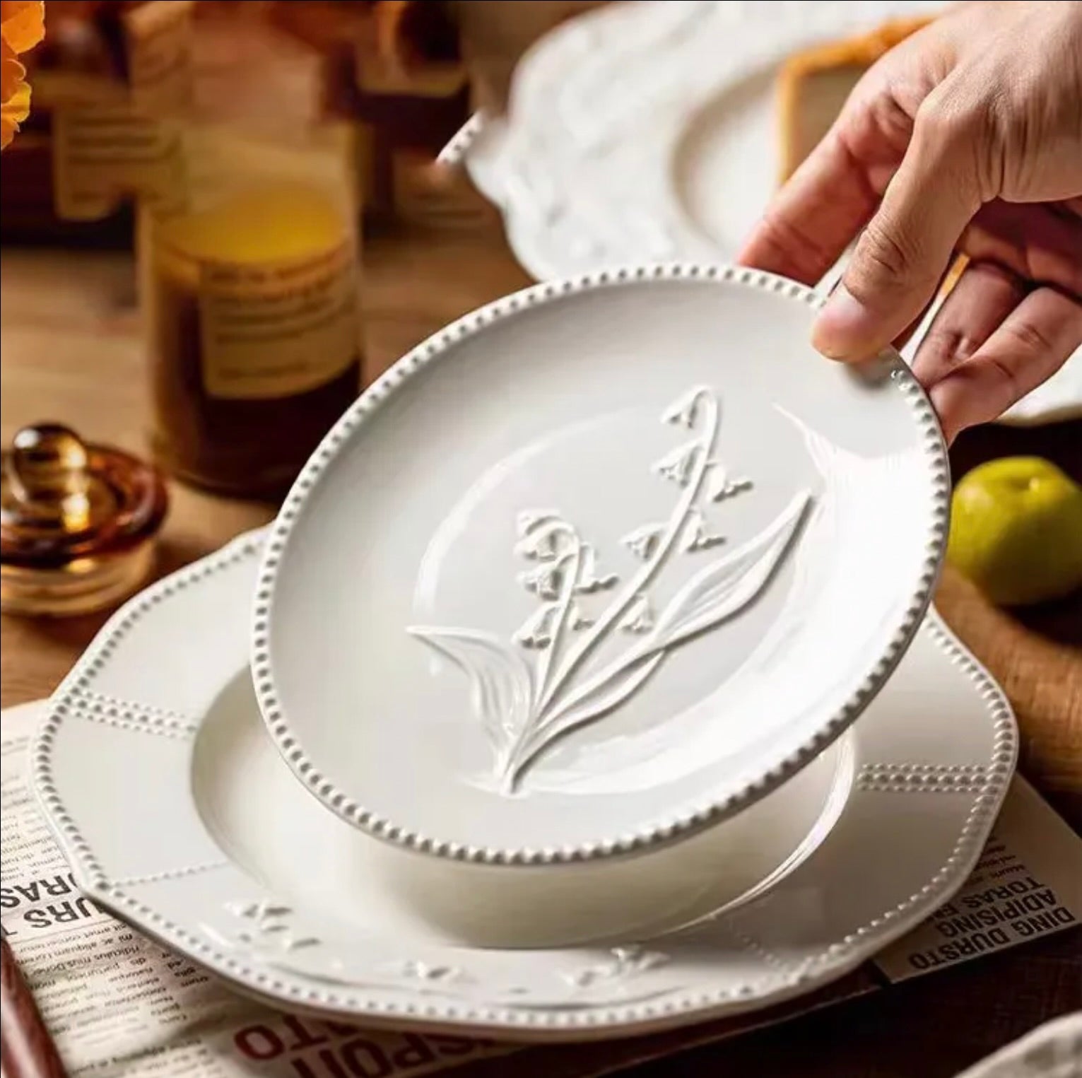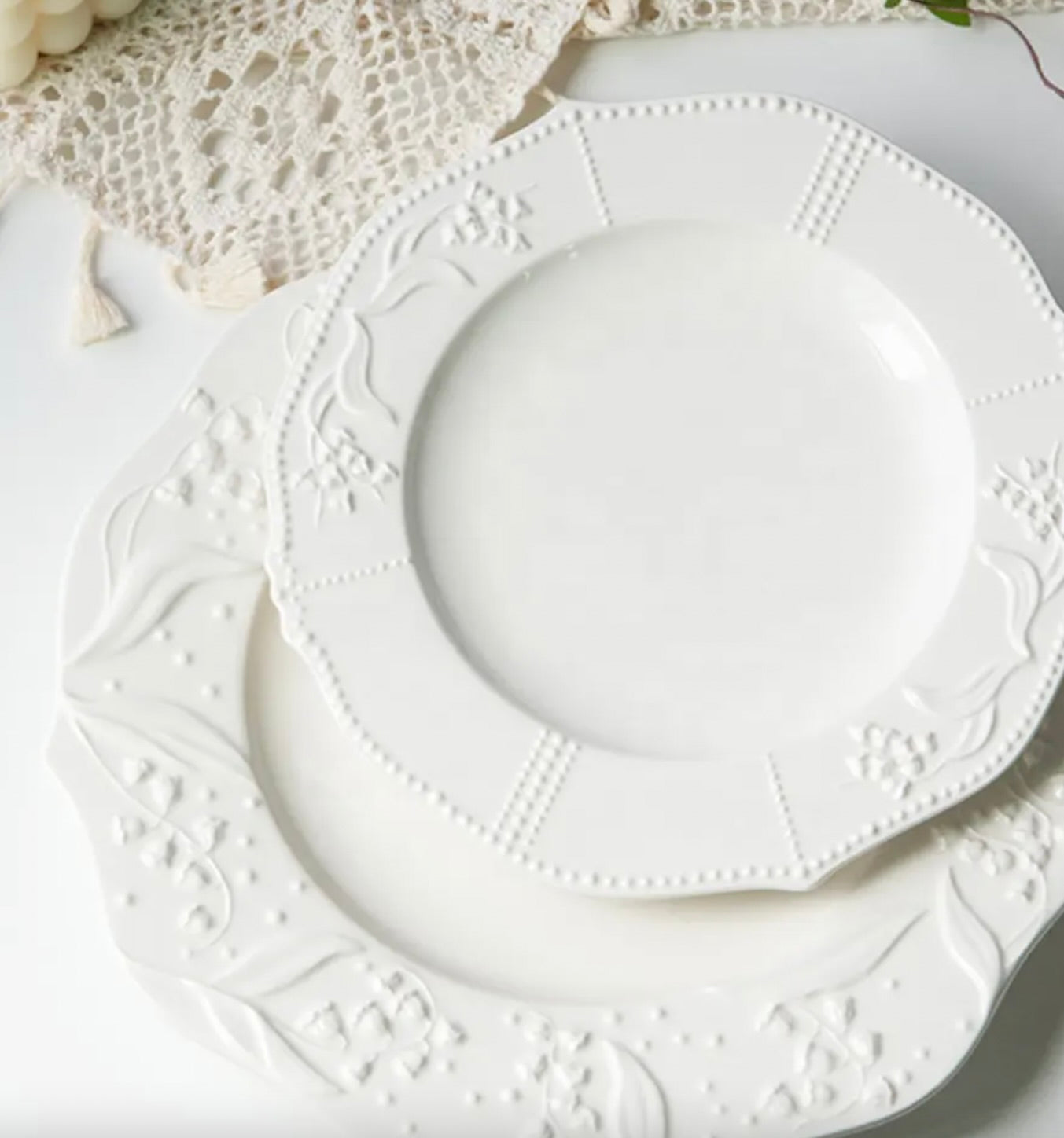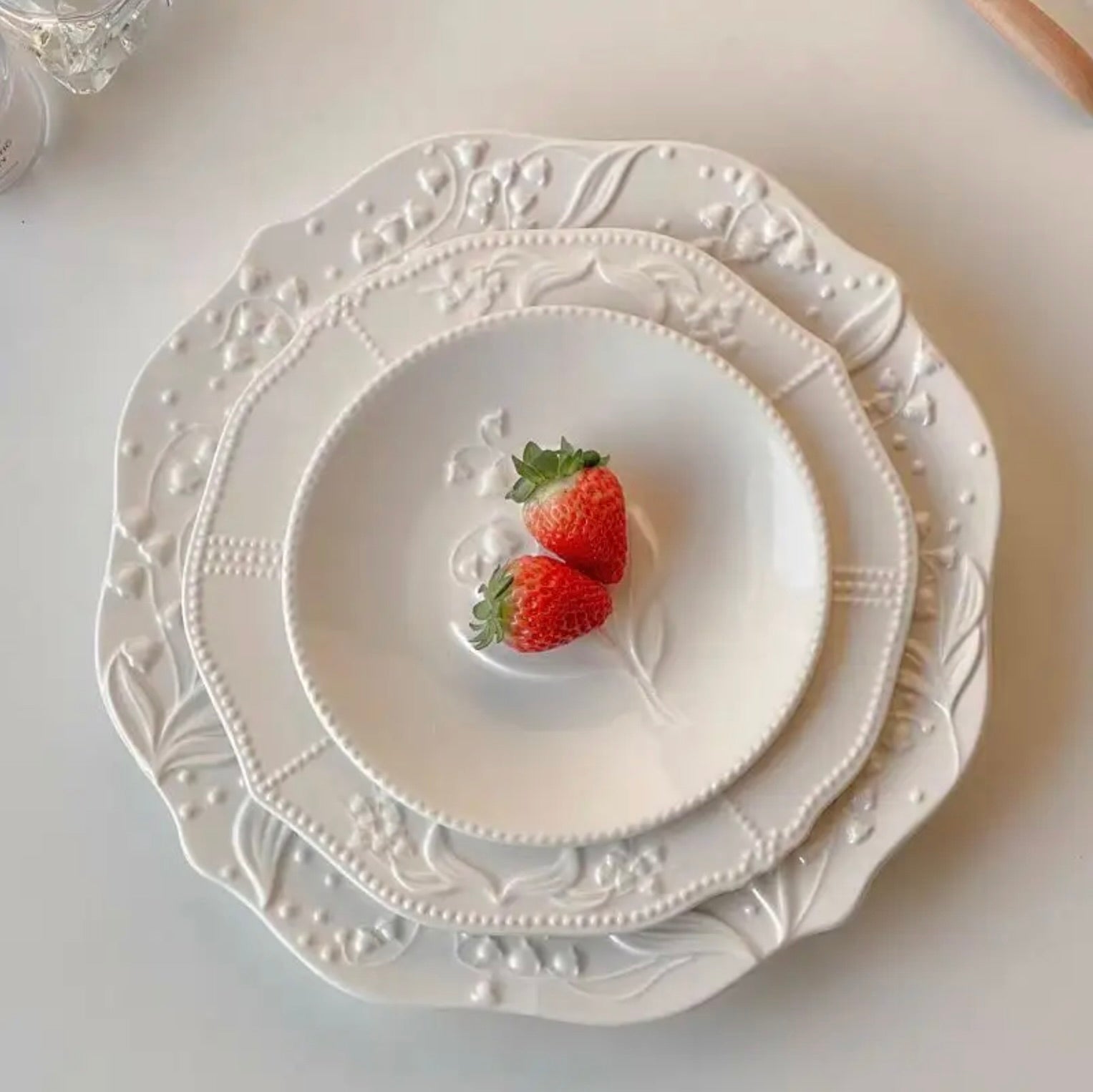 Elevate your dining experience with our exquisite 'Bella' White Ceramic Dessert Plate. This small yet sophisticated serving piece features delicate floral embossed along its pristine white ceramic surface. The refined craftsmanship and timeless design make it a perfect canvas for your culinary creations, adding an air of elegance to afternoon tea or evening desserts. Meticulously crafted from premium ceramic, each plate exhibits exceptional durability while maintaining its ethereal appearance. The subtle floral motifs create a captivating interplay of light and shadow across the plate's surface, enhancing the visual presentation of your finest confections. Whether complementing your existing dinnerware collection or standing alone as a statement piece, the 'Bella' plate transforms ordinary moments into extraordinary memories with its understated luxury and timeless charm.