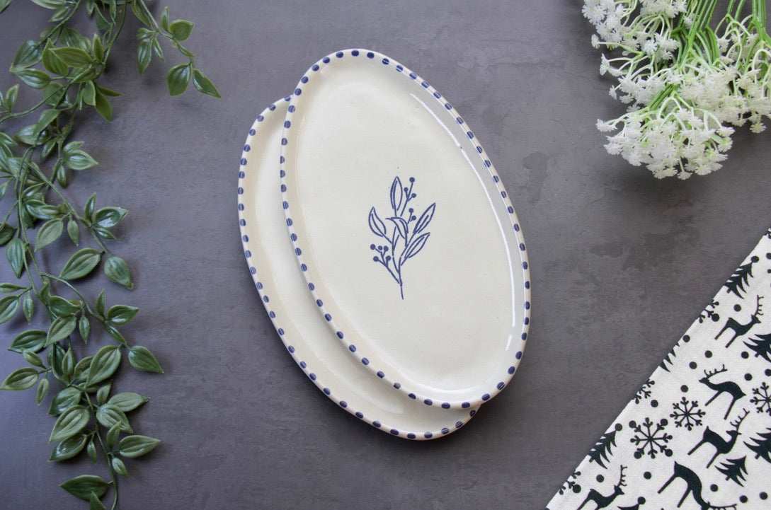 LThis artisanal oval platter showcases a distinctive half-glazed technique that balances refined craftsmanship with rustic charm. This nature inspired piece has soft, earthy tones and organic textures that belongs in a rustic kitchen and captures the quiet beauty of countryside living. The unglazed portion reveals authentic clay character, while the glazed half features subtle nature inspired detailing. Ideal for serving, entertaining, or curated display, this piece brings understated elegance and tactile warmth to any table setting. Each platter's individual glaze variations celebrate the handmade nature of the work.